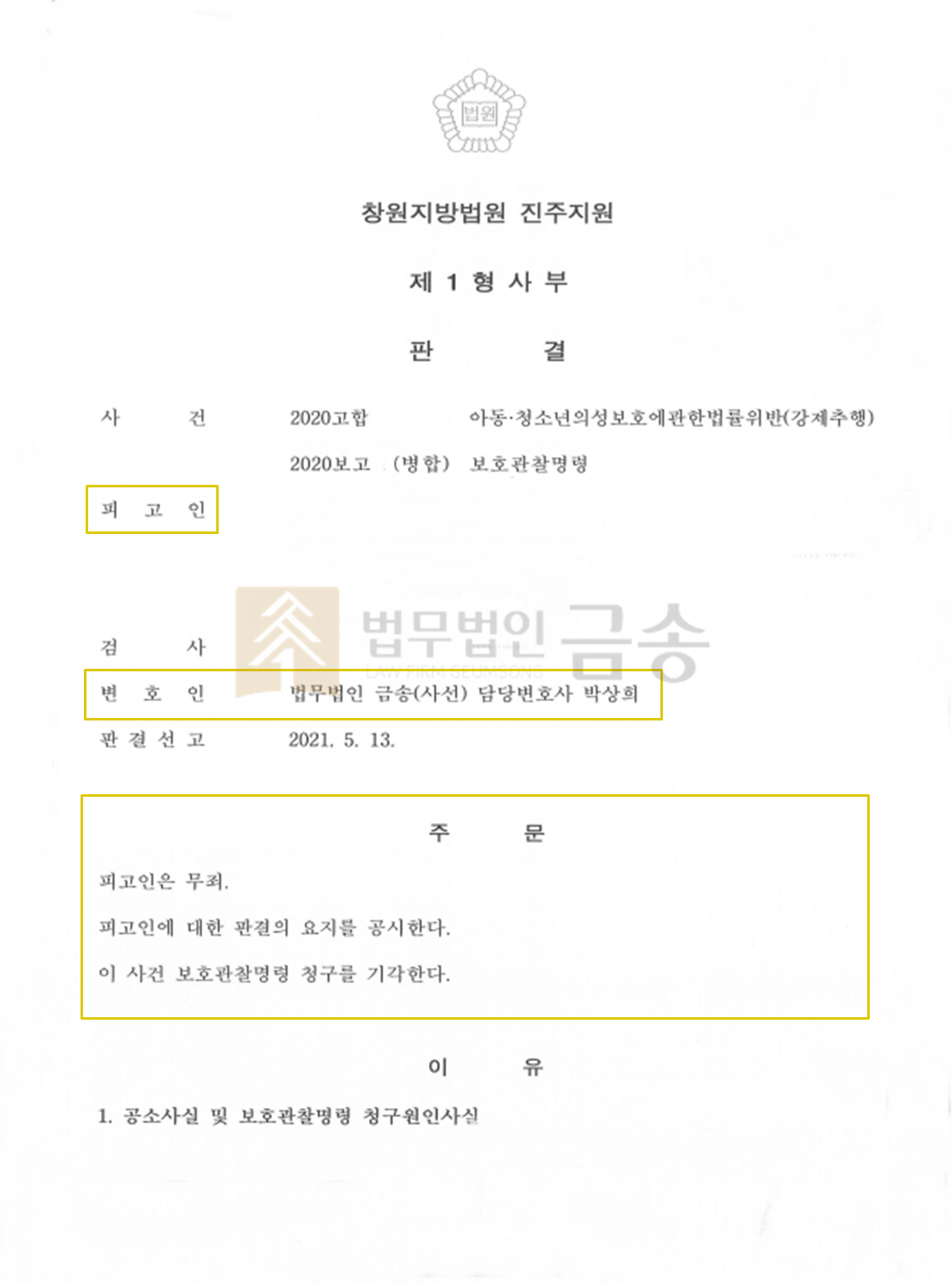 ¡á »ç°Ç °³¿ä ¡áÀÇ·ÚÀÎÀº ¹Ì¼º³âÀÚÀÎ ÇÇÇØÀÚ¸¦ ÀÚ½ÅÀÇ Â÷·® Á¶¼ö¼®¿¡ Å¿ö ¿îÀüÇÏ¿© °¡´ø Áß ¿À¸¥¼ÕÀ¸·Î ÇÇÇØÀÚÀÇ Çã¹÷Áö¸¦ ¾²´Ùµë¾ú°í, Àá½Ã ÈÄ »ç¹«½Ç·Î µ¹¾Æ¿Í ÇÇÇØÀÚ ¹× ´Ù¸¥ Çлýµé°ú ¾É¾Æ¼ À½½ÄÀ» ¸Ô´ø Áß ÇÇÇØÀÚÀÇ µî ºÎÀ§¸¦ ¾²´Ùµë´Â µî ¹Ì¼º³âÀÚ¸¦ »ó´ë·Î °Á¦ÃßÇàÀ» Çß´Ù¸ç °ø¼Ò°¡ Á¦±âµÇ¾ú½À´Ï´Ù.¡á º» »ç°ÇÀÇ Æ¯Â¡ ¡áÀÇ·ÚÀÎÀº °Á¦ÃßÇàÀ» ÇÑ ÀûÀÌ ¾øÀ½¿¡µµ ¹üÁËÇøÀǰ¡ ÀÎÁ¤µÈ´Ù¸ç ÀçÆÇÀ» ¹Þ°ÔµÇ¾î ¾ï¿ïÇÔÀ» Åä·ÎÇϰí ÀÖ°í, ƯÈ÷ ¹Ì¼º³â °Á¦ÃßÇàÀ̶ó´Â ÁËÀÇ Æ¯¼º»ó ÆÄ·ÅÄ¡¹üÀ̶ó´Â ÀÎ½Ä ¶§¹®¿¡ Á¤½ÅÀû ½ºÆ®·¹½º¸¦ ½ÉÇÏ°Ô ¹Þ°íÀÖ´Â »óȲÀ̾úÀ¸¸ç, ÀÌ·¯ÇÑ ¹®Á¦¸¦ ÇØ°áÇϱâ À§ÇØ ¹ý¹«¹ýÀÎ ¼°æÀ» ¼±ÀÓÇÏ¿´½À´Ï´Ù.¡á ¹ý¹«¹ýÀÎ ¼°æÀÇ Á¶·Â ¡á¹ý¹«¹ýÀÎ ¼°æÀº º» °ÇÀÇ °æ¿ì ÇÇÇØÀÚÀÇ Áø¼úÀÌ À¯ÀÏÇÑ Áõ°ÅÀ̹ǷÎ, ÃßÇàÀÌ ÀÖ¾ú´Ù´Â »ç°Ç ÇöÀå¿¡ ¼öÂ÷·Ê ¹æ¹®ÇÏ¿© ÀÇ·ÚÀÎÀ¸·ÎºÎÅÍ ÇöÀå ¼³¸íÀ» µéÀº ÈÄ »ç°ÇÀ» À籸¼ºÇÏ¿´°í, À̸¦ ¹ÙÅÁÀ¸·Î ÇÇÇØÀÚ Áø¼úÀÇ ¸ð¼øÁ¡°ú ½Åºù¼º¿¡ ÀǽÉÀÌ °¥ ¸¸ÇÑ »óȲµéÀ» È®ÀÎÇÏ¿© ÇÇÇØÀÚÀÇ Áø¼úÀ» ¹ÏÀ» ¼ö ¾ø´Ù´Â Á¡À» °·ÂÇÏ°Ô ÁÖÀåÇϰí ÀÔÁõÇÏ¿´À¸¸ç, ƯÈ÷ °Á¦ÃßÇàÀÌ ÀÖ¾ú´ø ´ç½ÃÀÇ ÇöÀå »çÁø°ú ÇÇÇØÀÚ°¡ ¾Ë ¼ö ¾ø¾ú´ø ÀÇ·ÚÀÎÀÇ ½ÅüÀû Ư¡À» ±Ù°Å·Î ÇÏ¿© ÃßÇàÀ» ´çÇß´Ù´Â ÇÇÇØÀÚÀÇ ÁÖÀåÀÌ Çö½ÇÀûÀ¸·Î´Â ºÒ°¡´ÉÇÏ´Ù´Â Á¡À» ÁÖÀå, ÀÔÁõÇÏ¿´½À´Ï´Ù.(°³ÀÎÁ¤º¸ ¹®Á¦·Î ÀÚ¼¼ÇÑ ³»¿ëÀ» Àû½ÃÇÏÁö ¸øÇÏ´Â Á¡¿¡ ´ëÇØ¼ ¾çÇØ ºÎʵ右´Ï´Ù.)¡á »ç°ÇÀÇ °á°ú ¡á¹ý¹«¹ýÀÎ ¼°æÀÇ ¹ý·üÁ¶·ÂÀÇ °á°ú, ¹ý¿ø¿¡¼´Â ÇÇÇØÀÚÀÇ Áø¼úÀ» ¹Ï±â ¾î·Á¿î »çÁ¤µéÀÌ ÀÖ´Ù¸ç º¯È£ÀÎÀÇ ÀǰßÀ» ¹Þ¾Æµé¿© °Ë»çÀÇ Â¡¿ªÇü ±¸Çü(¡¿ª 2³â)¿¡µµ ºÒ±¸ÇÏ°í ¹«ÁËÆÇ°áÀ» ³»·È½À´Ï´Ù.ÀÌ¿¡ ÀÇ·ÚÀÎÀº ÆÄ·ÅÄ¡ÇÑ ¹üÁËÀÚ¶ó´Â ¿À¸íÀ» ÇÇÇÏ°í º»ÀÎÀÇ ¸í¿¹¸¦ Áöų ¼ö ÀÖ°Ô µÇ¾ú½À´Ï´Ù.¡á ó¹ú±ÔÁ¤ ¡á¾Æµ¿Ã»¼Ò³âÀǼºº¸È£¿¡°üÇѹý·ü Á¦7Á¶ Á¦3Ç×