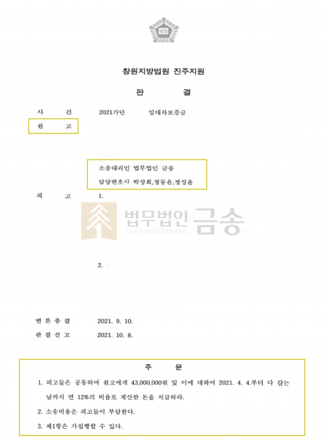 ¡á »ç°Ç °³¿ä ¡áÀÇ·ÚÀÎÀº ȸ»ç¿øÀ¸·Î ÁøÁÖ·Î ¹ß·ÉÀÌ ³ª¸é¼ A¹ýÀΰú B¹ýÀÎ °øµ¿¸íÀÇ·Î µÈ ¿ÀÇǽºÅÚÀ» º¸Áõ±Ý 4,300¸¸¿ø¿¡ ÀÓÂ÷Çϱâ·Î ÇÏ´Â °è¾àÀ» ü°áÇÏ¿´°í, °è¾à ü°á½Ã A¹ýÀÎÀÌ B¹ýÀÎÀ» ´ë¸®ÇÏ¿© ÀÓ´ëÂ÷°è¾àÀ» ü°áÇÏ¿´À¸¸ç, º¸Áõ±Ý ¶ÇÇÑ A¹ýÀÎÀÌ Áö±Þ¹Þ¾Ò½À´Ï´Ù.ÀÇ·ÚÀÎÀº 2³âÀÇ °è¾à±â°£ÀÌ ´Ù°¡¿ÀÀÚ A¹ýÀο¡°Ô °è¾àÀ» °»½ÅÇÏÁö ¾Ê°Ú´Ù´Â ÅëÁö¸¦ ÇÏ¿´À¸³ª, A¹ýÀÎÀÌ º¸Áõ±ÝÀ» ¹ÝÈ¯ÇØÁÖÁö ¾Ê¾Æ ÀÓ´ëÂ÷º¸Áõ±ÝÀ» ¹Ýȯ¹Þ°íÀÚ °øµ¿ÀÓ´ëÀÎÀÎ A¹ýÀΰú B¹ýÀÎÀ» »ó´ë·Î ÀÓ´ëÂ÷º¸Áõ±Ýû±¸ ¼Ò¼ÛÀ» Á¦±âÇÏ¿´½À´Ï´Ù.¡á »ç°ÇÀÇ ÀïÁ¡ ¡áA¹ýÀÎÀº ÀÓÂ÷ÀÎÀÎ ÀÇ·ÚÀο¡°Ô º¸Áõ±ÝÀ» ¹ÝȯÇÏ´Â °Í¿¡ ´ëÇØ¼ ´ÙÅõÁö¾Ê°í ÀÖÀ¸³ª, B¹ýÀÎÀº °è¾à ´ç½Ã ÇöÀå¿¡ Âü¼®ÇÏÁö ¾Ê¾Ò°í, º°µµÀÇ À§ÀÓÀå ¶ÇÇÑ Á¦ÃâµÇ¾î ÀÖÁö ¾ÊÀ¸¸ç, °è¾à¼¿¡ ³¯ÀÎµÈ B¹ýÀÎÀÇ µµÀåÀÌ À§Á¶µÈ °ÍÀ̶ó°í ÁÖÀåÇÏ´Â µî A¹ýÀο¡°Ô ÀÓ´ëÂ÷°è¾àÀ» ü°áÇÒ ´ë¸®±ÇÀ» À§ÀÓÇÑ ÀûÀÌ ¾ø´Ù°í ÁÖÀåÇϰí ÀÖ½À´Ï´Ù.º» °ÇÀÇ ÀïÁ¡Àº B¹ýÀÎÀÌ A¹ýÀο¡°Ô ÀÓ´ëÂ÷°è¾àÀ» ü°áÇÒ ´ë¸®±ÇÀ» À§ÀÓÇÏ¿´´ÂÁö ¿©ºÎÀÔ´Ï´Ù.¡á ¹ý¹«¹ýÀÎ ¼°æÀÇ Á¶·Â ¡á¹ý¹«¹ýÀÎ ¼°æÀº A¹ýÀÎÀÌ B¹ýÀÎÀ¸·ÎºÎÅÍ Æ÷°ý´ë¸®±ÇÀ» À§ÀÓ¹Þ¾ÒÀ¸¹Ç·Î °è¾à ´ç½Ã B¹ýÀÎÀÇ ´ëÇ¥À̻簡 Âü¼®ÇÏÁö ¾Æ´ÏÇÏ¿´´ø °ÍÀ̰í, ÀÌ¿¡ ´õÇÏ¿© Àû±ØÀûÀ¸·Î Áõ°Å¸¦ ¹ß±¼ÇÏ¿© ÀÌ·¯ÇÑ Æ÷°ý´ë¸®±ÇÀÌ ÀÖÀ½À» ÀÔÁõÇÏ¿´½À´Ï´Ù.¶ÇÇÑ ¹ý¹«¹ýÀÎ ¼°æÀº B¹ýÀÎÀÌ A¹ýÀÎÀ» »ó´ë·Î Á¦±âÇÑ º°°Ç ¼Ò¼Û ³»¿ëÀ» ±Ù°Å·Î B¹ýÀÎÀÇ ÁÖÀåÀÌ ÇãÀ§ÀÓÀ» ÁÖÀå, ÀÔÁõÇÏ´Â µî ÀÇ·ÚÀÎÀÇ ÀÔÀåÀÌ ¹Þ¾Æµé¿©Áú ¼ö ÀÖµµ·Ï Àû±ØÀûÀÎ º¯·ÐÀ» ÆîÃÆ½À´Ï´Ù.ÇÑÆí, º»°Ç°ú À¯»çÇÑ ¼ö½Ê °ÇÀÇ ¼Ò¼Û¿¡¼ ´Ü Çѹøµµ ´äº¯¼¸¦ Á¦ÃâÇÏÁö ¾Ê¾Ò´ø A¹ýÀÎÀº º» °Ç ¼Ò¼Û °úÁ¤¿¡¼ B¹ýÀÎÀÇ ÁÖÀåÀÌ ÇãÀ§¶ó´Â ÃëÁöÀÇ ´äº¯¼¸¦ Á¦ÃâÇÏ¿´°í, ÀÌ ´äº¯¼ ³»¿ëÀº ´Ù¸¥ ÀÓÂ÷ÀεéÀÌ Á¦±âÇÑ ¼Ò¼Û¿¡¼ À¯·ÂÇÑ Áõ°Å·Î »ç¿ëµÇ°í ÀÖ½À´Ï´Ù.(°³ÀÎÁ¤º¸ ¹®Á¦·Î ÀÚ¼¼ÇÑ ³»¿ëÀ» Àû½ÃÇÏÁö ¸øÇÏ´Â Á¡¿¡ ´ëÇØ¼ ¾çÇØ ºÎʵ右´Ï´Ù.)¡á »ç°ÇÀÇ °á°ú ¡á¹ý¹«¹ýÀÎ ¼°æÀÇ ¹ý·üÁ¶·ÂÀÇ °á°ú, ¹ý¿ø¿¡¼´Â °øµ¿ÀÓ´ëÀÎÀÎ A¹ýÀΰú B¹ýÀÎÀÌ ¿¬´ëÇÏ¿© ÀÓÂ÷ÀÎÀÎ ÀÇ·ÚÀο¡°Ô ÀÓ´ëÂ÷º¸Áõ±Ý 4,300¸¸¿øÀ» Áö±ÞÇ϶ó´Â ½Â¼Ò ÆÇ°áÀ» ÇÏ¿´½À´Ï´Ù.