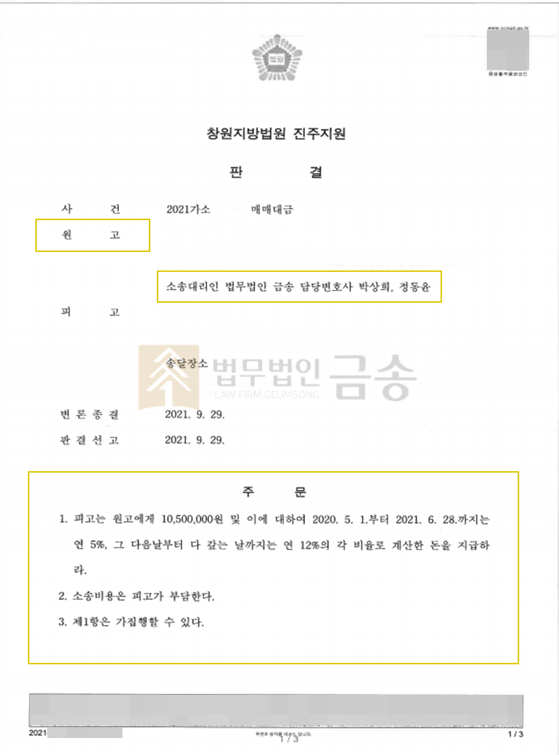 ¡á »ç°Ç °³¿ä ¡áÀÇ·ÚÀÎÀÌ ÇÇ°í¿¡°Ô ¹°°ÇÀ» ÆÇ¸ÅÇÏ¸é¼ Çǰí·ÎºÎÅÍ ´ë±ÝÀ» Áö±Þ ¹Þ¾Æ¾ß Çϴµ¥ ´ë±ÝÀ» 1³âÀÌ Áö³ªµµ·Ï Áö±ÞÇÏÁö ¾Ê°í ¹Ì·çÀÚ ÀÌ°Ç ¼Ò¼ÛÀ» Á¦±âÇÏ°Ô µÇ¾ú½À´Ï´Ù.¡á º» »ç°ÇÀÇ Æ¯Â¡ ¡áÀÇ·ÚÀÎÀº 2019³â°æ ÇÇ°í¿¡°Ô ¸Å¸Å´ë±Ý 2,300¸¸¿ø¿¡ ¹°°ÇÀ» ÆÇ¸ÅÇϰí Çǰí·ÎºÎÅÍ 6°³¿ù µ¿¾È ÃÑ 1,050¸¸¿øÀ» Áö±Þ¹Þ¾Ò´Âµ¥ ÇÇ°í°¡ µ·ÀÌ ¾ø´Ù°í ÇÏ¿© 200¸¸¿øÀ» °¨¾×ÇØÁÖ°í ³²Àº 1,050¸¸¿ø¸¸ Áö±Þ¹Þ±â·Î ÇÕÀÇÇÏ¿´½À´Ï´Ù.±×·±µ¥ Çǰí´Â ³²Àº ´ë±Ýµµ ÀÇ·ÚÀο¡°Ô Áö±ÞÇÏÁö ¾Ê°í ³ªÁß¿¡´Â ÀÇ·ÚÀÎÀÇ ¿¬¶ôÁ¶Â÷ ¹ÞÁö ¾Ê´Â ¸ð½ÀÀ» º¸ÀÌ¸ç ¸Å¸Å´ë±ÝÀ» Áö±ÞÇÏÁö ¾Ê°íÀÚ ÇÏ¿´½À´Ï´Ù.¡á ¹ý¹«¹ýÀÎ ¼°æÀÇ Á¶·Â ¡áº» ¹ý¹«¹ýÀÎ ¼°æ¿¡¼´Â ÀÇ·ÚÀΰú ¼ÒÅëÀ» ÅëÇÏ¿© ÀÇ·ÚÀÎÀÌ ÇÇ°í¿¡°Ô ¹°Ç°À» ÆÇ¸ÅÇÑ »ç½Ç, Çǰí·ÎºÎÅÍ ´ë±ÝÀÇ ÀϺθ¦ ¹ÞÀº »ç½Ç, 200¸¸¿øÀ» °¨¾×ÇØ ÁÖ°í ³²Àº ´ë±ÝÀ» Áö±ÞÇϱâ·Î ÇùÀÇÇÑ »ç½Ç, ÇöÀç ³²Àº ´ë±ÝÁ¶Â÷ Áö±ÞÇÏÁö ¾Ê´Â »ç½Ç¿¡ °üÇÏ¿© È®ÀÎÇÒ ¼ö ÀÖ´Â ÀÚ·á¿Í Áõ°ÅµéÀ» ÃÑ ¼öÁýÇÏ°í ¸íÈ®ÇÏ°Ô Á¤¸®ÇÏ¿© ÀÌ »ç°Ç ¼Ò¼ÛÀ» Á¦±âÇÏ¿´½À´Ï´Ù.¼ÒÀåÀ» ¼Û´Þ¹ÞÀº ÇÇ°í°¡ Áö±ÞÇÏÁö ¾ÊÀº ¸Å¸Å´ë±Ý ÀüºÎ¸¦ ÀÌ¹Ì Áö±ÞÇÏ¿´´Ù°í ´äº¯ÇÏ¿´´Âµ¥ ¹ý¹«¹ýÀÎ ¼°æ¿¡¼´Â ÇǰíÀÇ °ÅÁþ ÁÖÀå¿¡ ´ëÇÑ ±¸Ã¼ÀûÀÎ ¹Ý¹Ú ³»¿ëÀ» Á¤¸®ÇÑ ¼¸éÀ» ¹ý¿ø¿¡ Á¦ÃâÇÏ¿´°í, ÀÇ·ÚÀο¡°Ô ¸Å¸Å´ë±ÝÀ» Áö±ÞÇÒ Àǹ«°¡ ÀÖÀ½À» ÁÖÀåÇϸç Àû±ØÀûÀÎ º¯·ÐÀ» ÆîÃÆ½À´Ï´Ù.¡á »ç°ÇÀÇ °á°ú ¡á¹ý¹«¹ýÀÎ ¼°æÀÇ ¹ý·üÁ¶·ÂÀÇ °á°ú, ¹ý¿ø¿¡¼´Â ÀÇ·ÚÀÎÀÌ ÇÇ°í¿¡°Ô ¹°°ÇÀ» ¸ÅµµÇÑ »ç½Ç, ÀÇ·ÚÀÎÀÇ ¹è·Á·Î ¸Å¸Å´ë±Ý Áß ÀϺθ¦ °¨¾×ÇÏ°í ³²Àº 1,050¸¸¿øÀ» ÇÇ°í°¡ Áö±ÞÇϱâ·Î ÇùÀÇÇÑ »ç½Ç, ±×·³¿¡µµ ºÒ±¸Çϰí ÇÇ°í°¡ ¸Å¸Å´ë±ÝÀ» Áö±ÞÇÏÁö ¾ÊÀº »ç½Ç µîÀ» ÀüºÎ ¹Þ¾Æµé¿© ÇÇ°í°¡ ÀÇ·ÚÀο¡°Ô ¸Å¸Å´ë±Ý 1,050¸¸¿øÀ» ÀüºÎ Áö±ÞÇÒ °ÍÀ» ÆÇ°áÇÏ¿´½À´Ï´Ù.