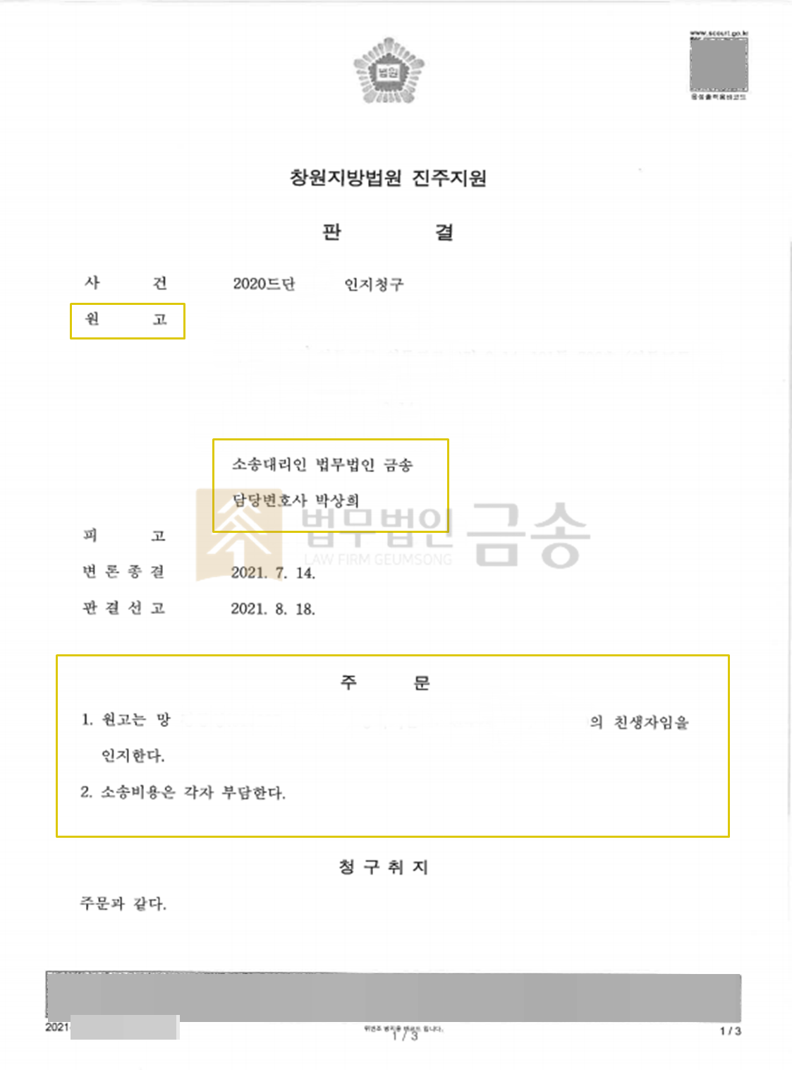¡á »ç°Ç °³¿ä ¡á ÀÇ·ÚÀÎÀÇ ¾î¸Ó´Ï´Â ¹ÌÈ¥À¸·Î »ì´ø Áß À¯ºÎ³²ÀÎ ÀÇ·ÚÀÎÀÇ ¾Æ¹öÁö¸¦ ¸¸³ª°Ô µÇ¾ú°í, ÀÇ·ÚÀÎÀÇ ¾Æ¹öÁö¿Í ±³Á¦ÇÏ´ø Áß¿¡ È¥¿ÜÀÚÀÎ ÀÇ·ÚÀÎÀ» Ãâ»êÇÏ¿´½À´Ï´Ù.ÇÏÁö¸¸ ¾Æ¹öÁö°¡ ÀÌ¹Ì °¡Á¤ÀÌ ÀÖ´Â »ç¶÷À̾ú±â ¶§¹®¿¡ ÀÇ·ÚÀÎÀÇ ¾î¸Ó´Ï´Â ¾Æ¹öÁöÀÇ ¹ØÀ¸·Î Ãâ»ý½Å°í¸¦ ÇÏÁö ¸øÇϰí, º»ÀÎÀÇ ¹ØÀ¸·Î Ãâ»ý½Å°í¸¦ ÇÏ¿© Ȧ·Î ÀÇ·ÚÀÎÀ» Ű¿ö¿Ô°í, °£°£È÷ ÀÇ·ÚÀÎÀÇ ¾Æ¹öÁö°¡ ÀÇ·ÚÀÎÀ» ¸¸³ª·¯ ¿À°ï ÇÏ¿´½À´Ï´Ù.ÀÇ·ÚÀÎÀÇ ¾Æ¹öÁö´Â Æò¼Ò Á×±â Àü¿¡ È£Àû Á¤¸®¸¦ ÇØ ÁÖ°Ú´Ù°í ¸»ÇÏ¿´À¸³ª, È£ÀûÀÌ Á¤¸®µÇÁö ¾ÊÀº »óȲ¿¡¼ °©ÀÛ½º·´°Ô ¾²·¯Á® »ç¸ÁÇÏ°Ô µÇ¾ú½À´Ï´Ù.ÀÇ·ÚÀÎÀº Áö±Ý¿¡¼¶óµµ º»ÀÎÀÇ »Ñ¸®¸¦ ã°íÀÚ ÀÎÁö û±¸¸¦ ÇÏ°Ô µÇ¾ú½À´Ï´Ù.¡á »ç°ÇÀÇ ÀïÁ¡ ¡á º» »ç°ÇÀº ÀÇ·ÚÀÎÀÌ ¾Æ¹öÁö¿ÍÀÇ »çÀÌ¿¡¼ Ç÷¿¬°ü°è°¡ Á¸ÀçÇÏ´ÂÁö, ¾Æ¹öÁö¿ÍÀÇ »çÀÌ¿¡¼ ºÎ¸ð¿Í ÀÚ½Ä ¿©ºÎ¸¦ È®ÀÎÇÒ ¼ö ÀÖ´Â ¼·ùµéÀÌ Á¸ÀçÇÏ´ÂÁö°¡ ÀïÁ¡À̾ú½À´Ï´Ù.¡á ¹ý¹«¹ýÀÎ ¼°æÀÇ Á¶·Â ¡á ¹ý¹«¹ýÀÎ ¼°æÀº À¯ÀüÀÚ °Ë»ç¸¦ Çϱâ À§ÇØ µ¹¾Æ°¡½Å ¾Æ¹öÁöÀÇ Ä£ÀÚ¸¦ È®ÀÎÇÑ ÈÄ ÀÌ Ä£ÀÚ¿ÍÀÇ À¯ÀüÀÚ °Ë»ç¸¦ ÅëÇØ ÀÇ·ÚÀΰú µ¿ÀÏ ºÎ°èÀÎÁö ¿©ºÎ¸¦ È®ÀÎÇÏ¿´½À´Ï´Ù.ÀÌ¿Í º°µµ·Î ¾Æ¹öÁöÀÇ Ä£ÀÚ°¡ À¯ÀüÀÚ °Ë»ç¿¡ ÀÀÇÏÁö ¾ÊÀ» °¡´É¼ºÀÌ ÀÖÀ¸¹Ç·Î ÀÇ·ÚÀΰú ¾Æ¹öÁö »çÀÌ¿¡ ºÎ¸ð¿Í ÀÚ½Ä °ü°èÀÓÀ» È®ÀÎÇÒ ¼ö ÀÖ´Â °´°üÀûÀÎ Áõ°ÅµéÀ» ¹ß±¼ÇÏ¿© ¹ý¿ø¿¡ Á¦ÃâÇÏ¿´½À´Ï´Ù.(°³ÀÎÁ¤º¸ ¹®Á¦·Î ÀÚ¼¼ÇÑ ³»¿ëÀ» Àû½ÃÇÏÁö ¸øÇÏ´Â Á¡¿¡ ´ëÇØ¼ ¾çÇØ ºÎʵ右´Ï´Ù.)¡á »ç°ÇÀÇ °á°ú ¡á ¹ý¹«¹ýÀÎ ¼°æÀÇ ¹ý·üÁ¶·ÂÀÇ °á°ú, ¹ý¿ø¿¡¼´Â ÀÇ·ÚÀΰú µ¹¾Æ°¡½Å ¾Æ¹öÁö°¡ Ä£»ýÀÚÀÓÀ» ÀÎÁöÇÏ´Â ½Â¼Ò ÆÇ°áÀ» ÇÏ¿´½À´Ï´Ù.