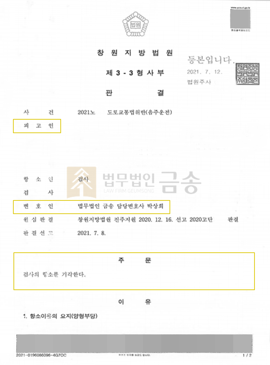 ¡á »ç°Ç °³¿ä ¡áÀÇ·ÚÀÎÀº °ú°Å 1ȸ À½ÁÖ¿îÀüÀ» ÇÑ »ç½ÇÀÌ ÀÖÀ½¿¡µµ Ç÷Áß¾ËÄÚ¿Ã³óµµ 0.143%ÀÇ ¼ú¿¡ ÃëÇÑ »óÅ·Π¾à 600m¸¦ ¿îÀüÇÏ¿´°í, º» ¹ý¹«¹ýÀÎ ¼°æÀÇ Á¶·ÂÀ¸·Î 1½É¿¡¼ ¹ú±ÝÇüÀÇ ÆÇ°áÀ» ¼±°í¹Þ¾ÒÀ¸³ª, Çü·®ÀÌ ³·´Ù´Â ÀÌÀ¯·Î °Ë»ç°¡ Ç×¼Ò¸¦ ÇÏ¿© â¿øÁö¹æ¹ý¿ø¿¡¼ Ç×¼Ò½ÉÀÌ ¿·È½À´Ï´Ù.¡á º» »ç°ÇÀÇ Æ¯Â¡ ¡á°Ë»ç°¡ À½ÁÖ¿îÀüÀÇ ÆóÇØ°¡ Å« ¸¸Å ¡¿ªÇüÀÇ ¾ö¹ú¿¡ Ã³ÇØ¾ß Àç¹ßÀ» ¹æÁöÇÒ ¼ö ÀÖ´Ù°í ÇÏ¸é¼ Ç×¼Ò¸¦ ÇÏÀÚ, ÀÇ·ÚÀÎÀº ÀÌ·¯ÇÑ °Ë»çÀÇ Ç×¼Ò¸¦ ±â°¢½Ã۱â À§ÇØ º» ¹ý¹«¹ýÀÎÀ» ¹Ï°í ´Ù½Ã ã°Ô µÇ¾ú½À´Ï´Ù.¡á ¹ý¹«¹ýÀÎ ¼°æÀÇ Á¶·Â ¡á¹ý¹«¹ýÀÎ ¼°æÀº À½ÁÖ¿îÀü 2ȸ ÀÌ»ó À§¹Ý ½Ã Àû¿ëµÇ´Â ó¹ú±ÔÁ¤ÀÌ °Ë»ç°¡ ÁÖÀåÇÏ´Â ¾ö¹úÀÇ Çʿ伺À» ÀÌÀ¯·Î À½ÁÖ¿îÀü 1ȸ À§¹ÝÇÒ ¶§ Àû¿ëµÈ ´Ü¼ø À½ÁÖ¿îÀü ó¹ú ±ÔÁ¤º¸´Ù °ÈµÈ °³Á¤ µµ·Î±³Åë¹ýÀÌ ÀÌ¹Ì ½ÃÇàÁßÀ̹ǷΠÀÌ·¯ÇÑ °ÈµÈ ¹ý ±ÔÁ¤ÀÇ Àû¿ëÀ» ¹Þ°Ô µÊÀ¸·Î½á ÀÌ¹Ì ¾ö¹ú¿¡ Ã³ÇØÁö°í ÀÖÀ½À» ÇÇ·ÂÇÏ¿´½À´Ï´Ù.ƯÈ÷ ÀÇ·ÚÀÎÀÌ Â¡¿ªÇüÀ» ¹Þ°Ô µÉ °æ¿ì ÇØ°í »çÀ¯¿¡ ÇØ´çÇÏ´Â Á¡ µîÀÇ ¿©·¯ ¾çÇü ÂüÀÛ»çÀ¯¸¦ ÁÖÀåÇÏ¸é¼ ¿ø½ÉÀÎ 1½É ÆÇ°áÀÌ °áÄÚ °ú°æÇÑ ÆÇ°áÀÌ ¾Æ´Ï¶ó µµ·Î±³Åë¹ýÀÌ ÀÌ·ç°íÀÚ ÇÏ´Â ¸ñÀû°ú ÀÇ·ÚÀÎÀÇ »çÁ¤À» ¸ðµÎ ÂüÀÛÇÑ ÀûÀýÇÑ ÆÇ°áÀ̾úÀ½À» ÁÖÀåÇÏ¿´½À´Ï´Ù.(°³ÀÎÁ¤º¸ ¹®Á¦·Î ÀÚ¼¼ÇÑ ³»¿ëÀ» Àû½ÃÇÏÁö ¸øÇÏ´Â Á¡¿¡ ´ëÇØ¼ ¾çÇØ ºÎʵ右´Ï´Ù.)¡á »ç°ÇÀÇ °á°ú ¡á¹ý¹«¹ýÀÎ ¼°æÀÇ ¹ý·üÁ¶·ÂÀÇ °á°ú, ¹ý¿ø¿¡¼´Â º¯È£ÀÎÀÇ ÀǰßÀ» ¹Þ¾Æµé¿© °Ë»çÀÇ Ç×¼Ò¸¦ ±â°¢ÇÏ´Â ÆÇ°áÀ» ³»·ÈÀ¸¸ç, ÀÌ ÆÇ°á¿¡ ´ëÇØ °Ë»ç°¡ »ó°íÇÏÁö ¾Ê¾Æ ÀÇ·ÚÀÎÀº °øÁ÷À» À¯ÁöÇÒ ¼ö ÀÖ°Ô µÇ¾ú½À´Ï´Ù.¡á ó¹ú ±ÔÁ¤ ¡áµµ·Î±³Åë¹ý Á¦182Á¶ÀÇ2 Á¦1Ç×(À½ÁÖ¿îÀü)