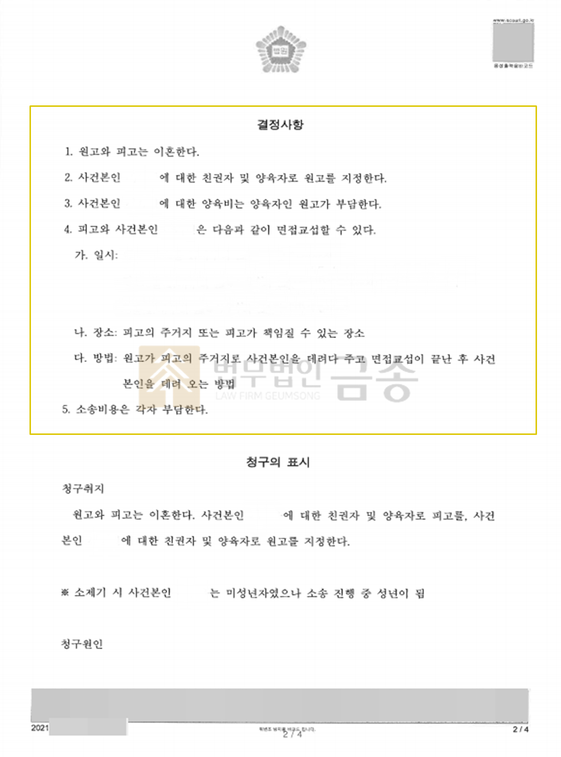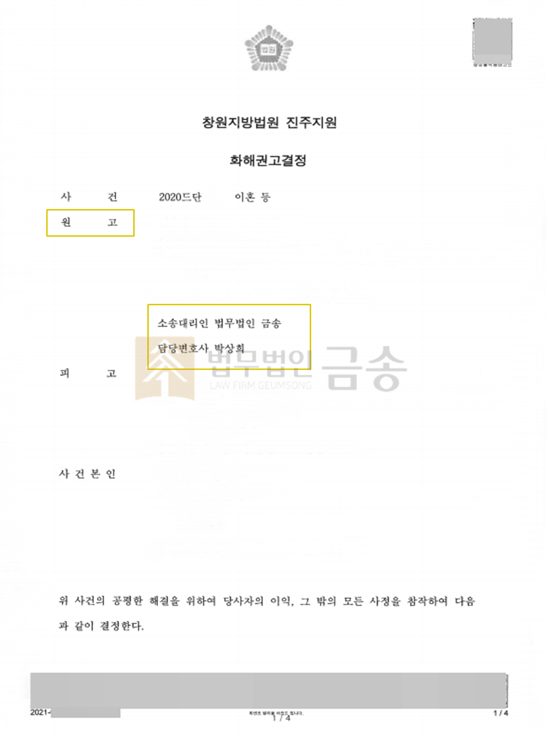 ¡á »ç°Ç °³¿ä ¡áÀÇ·ÚÀÎÀº 20³â °áÈ¥»ýȰ Áß ³²ÆíÀÌ ¼öÂ÷·Ê ¿Üµµ¸¦ Çϰí, ÆøÇàÀ» ÀÏ»ï¾ÒÀ¸³ª ¾ÆÀ̵éÀ» À§Çؼ¶óµµ È¥ÀÎÀ» À¯ÁöÇÏ·Á´Â ¸¶À½¿¡ Âü°í »ì¾Æ¿Ô½À´Ï´Ù. ±×·¯´ø Áß ¸·³»°¡ º¸´Â ¾Õ¿¡¼ ÆøÇàÀ» ´çÇÏ°Ô µÇÀÚ, ¸·³»¸¦ µ¥¸®°í ÁýÀ» ³ª¿Í ÀÌÈ¥ ¼Ò¼ÛÀ» Á¦±âÇÏ°Ô µÇ¾ú½À´Ï´Ù.¡á º» »ç°ÇÀÇ Æ¯Â¡ ¡áÀÇ·ÚÀÎÀº óÀ½¿¡´Â º¯È£»ç¸¦ ¼±ÀÓÇÏÁö ¾Ê°í ½º½º·Î ¼ÒÀåÀ» ÀÛ¼ºÇؼ ÀÌÈ¥ ¼Ò¼ÛÀ» û±¸ÇÏ¿´À¸³ª, ÁÖÀå°ú Áõ°Å°¡ Á¦´ë·Î Á¤¸®µÇÁö ¾Ê¾Æ ÀÌÈ¥ ÀÚü°¡ ÀÌ·ç¾îÁöÁö ¾ÊÀ» À§Çè¿¡ óÇÏ°Ô µÇ¾ú½À´Ï´Ù.ÀÌ¿¡ Á¦´ë·Î µÈ ÀçÆÇÀ» À§ÇÏ¿© ¹ý¹«¹ýÀÎ ¼°æÀ» ã¾ÆÁּ̰í, Áö¿Á°°Àº °áÈ¥»ýȰ¿¡¼ ¹þ¾î³¯ ¼ö ÀÖµµ·Ï µµ¿òÀ» ¿äûÇϼ̽À´Ï´Ù. ¾Æ½±°Ôµµ ³²ÆíÀÇ ¿Üµµ³ª Æø·ÂÀ» ÀÔÁõÇÒ¸¸ÇÑ Áõ°Å°¡ µüÈ÷ ¾ø¾ú°í, Àڽĵ鿡°Ô ¾Æ¹öÁöÀÇ ¾ÇÇàÀ» À̾߱âÇÏ°Ô ¸¸µå´Â »óȲµµ ¿øÄ¡ ¾ÊÀ¸¼Ì½À´Ï´Ù. ³²ÆíÀº Àý´ë ÀÌÈ¥Àº ¾ÈÇØÁØ´Ù°í ¹öƼ°í ÀÖ¾î ¹ý¸®ÀûÀ¸·Î´Â ÀÌÈ¥ÀÌ ½±Áö´Â ¾Ê¾Ò½À´Ï´Ù.¡á ¹ý¹«¹ýÀÎ ¼°æÀÇ Á¶·Â ¡áº» ¹ý¹«¹ýÀÎ ¼°æ¿¡¼´Â ÀÇ·ÚÀÎÀÇ ÀÌÈ¥À» ¼º»ç½Ã۰í, ¸·³»¸¦ ¿ì¸®°¡ Ű¿ï ¼ö ÀÖµµ·Ï ÁغñÇÏ¿´½À´Ï´Ù.³²ÆíÀÇ ¿Üµµ, ÆøÇà µîÀ» ÀÔÁõÇÒ °´°üÀûÀÎ Áõ°Å´Â ¾ø¾úÀ¸³ª, °¡»çÁ¶»ç°üÀ» ÅëÇØ È¥ÀÎÀÌ Áö¼ÓµÉ ¼ö ¾ø´Â »çÁ¤À» ÆÇ»ç´Ô²² ÇöÃâ½ÃÄÑ ÀÌÈ¥ÀÌ ÀÌ·ç¾îÁ®¾ß ÇÔÀ» Àû±ØÀûÀ¸·Î ÁÖÀåÇÏ´Â ÇÑÆí, ÀÚ³à¾çÀ°È¯°æÁ¶»ç¸¦ ÅëÇØ ¸·³»¾ÆÀÌÀÇ ¾çÀ°À» ¾Æ³»°¡ ÇÒ ¼ö ÀÖµµ·Ï °·ÂÈ÷ ¾îÇÊÇÏ¿´½À´Ï´Ù.(°³ÀÎÁ¤º¸ ¹®Á¦·Î »ó¼¼ÇÑ ³»¿ëÀ» ±âÀçÇÏÁö ¸øÇÏ´Â Á¡ ¾çÇØ ºÎʵ右´Ï´Ù.)¡á »ç°ÇÀÇ °á°ú ¡á¹ý¹«¹ýÀÎ ¼°æÀÇ ¹ý·ü Á¶·ÂÀÇ °á°ú, ÀÇ·ÚÀÎÀº ÀÌÈ¥¿¡ ¼º°øÇÒ ¼ö ÀÖ¾úÀ¸¸ç, ¸·³»ÀÇ Ä£±Ç°ú ¾çÀ°±ÇÀ» Áöų ¼ö ÀÖ¾ú½À´Ï´Ù. ´õ¿íÀÌ 1½É ÀçÆÇ¿¡¼ ÈÇØ±Ç°í°áÁ¤À¸·Î È®Á¤µÇ´Â ´öºÐ¿¡ ÀçÆÇÀÌ °É¸®´Â ±â°£µµ ¸Å¿ì ª°Ô ¼Ò¿äµÇ¾î ºñ±³Àû »¡¸® ¿øÇÏ´Â ¹Ù¸¦ ¸ðµÎ ÀÌ·ê ¼ö ÀÖ°Ô µÇ¼Ì½À´Ï´Ù.